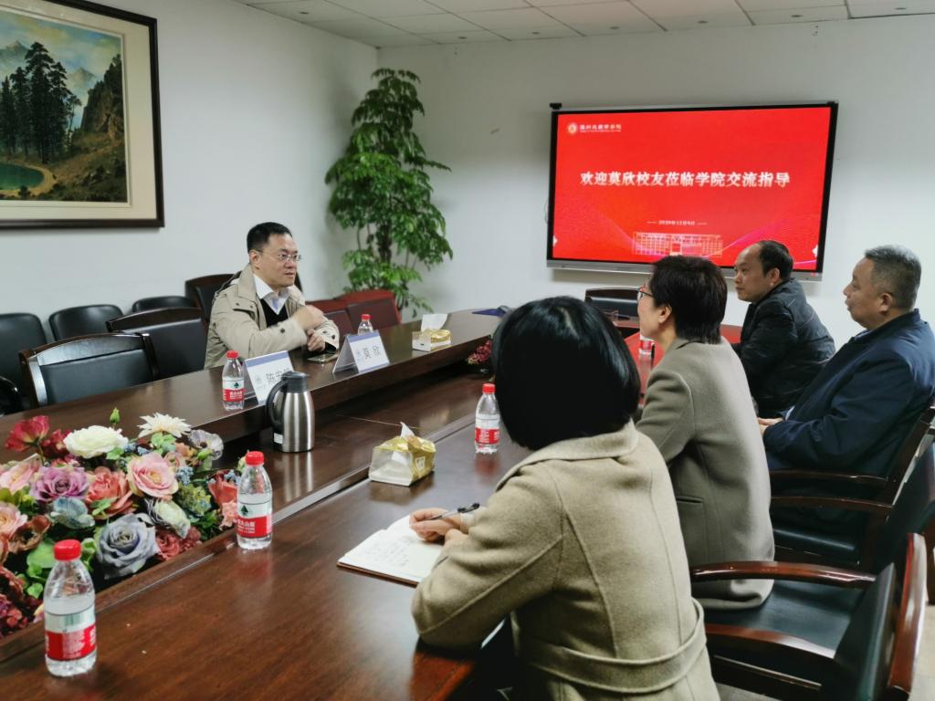 校友会副会长、90国贸莫欣校友来院交流指导,院长胡振华、党委书记郑彩莲、副书记唐华、办公室主任张素琴予以接待,双方在信息楼A222会议室展开座谈,并走访参观了考研自习室样板间、学院文化长廊、仲辉商道讲堂等。