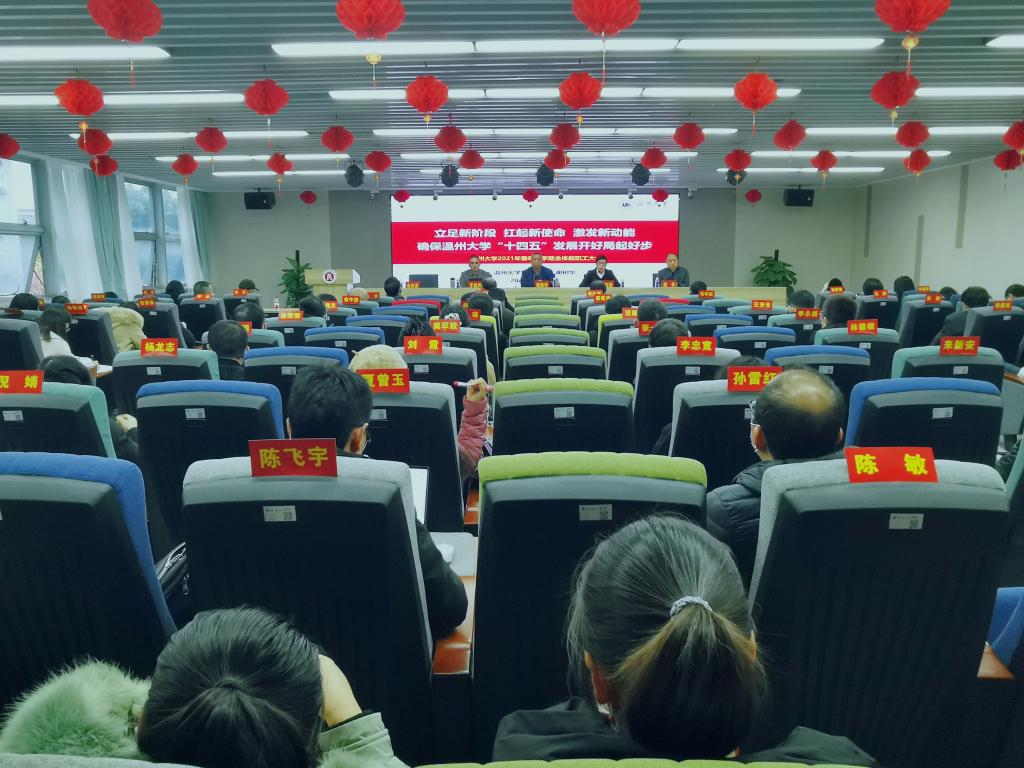 会议还学习了校长赵敏的《抢抓机遇 锚定目标 乘势而上 全力谱写新时代学校高质量发展新篇章》报告精神。赵敏校长在报告中总结了过去一年全体“温大人”办学治校的优异成绩、呈现出的“六大亮点”,对学校2021年的工作进行部署,并指出要重点做好的十个方面工作。