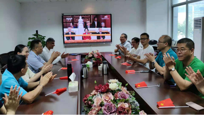 许多老师情到深处,不禁掩面洒下热泪,结合自己的切身体会分享中国共产党给自己带来的实实在在的改变,还有老师在现场即兴吟诵,祝福伟大的党。学院来自巴基斯坦的外籍教师吴丁今天一早也来到会场,与大家一起观看直播,在热议环节,他说,“我特别荣幸能见证中国共产党100周岁生日,来到中国7年,我深切地感受到了这个国家的伟大与日益繁盛,我也愈发爱上了这里,深深地祝福中国共产党和中国人民”。