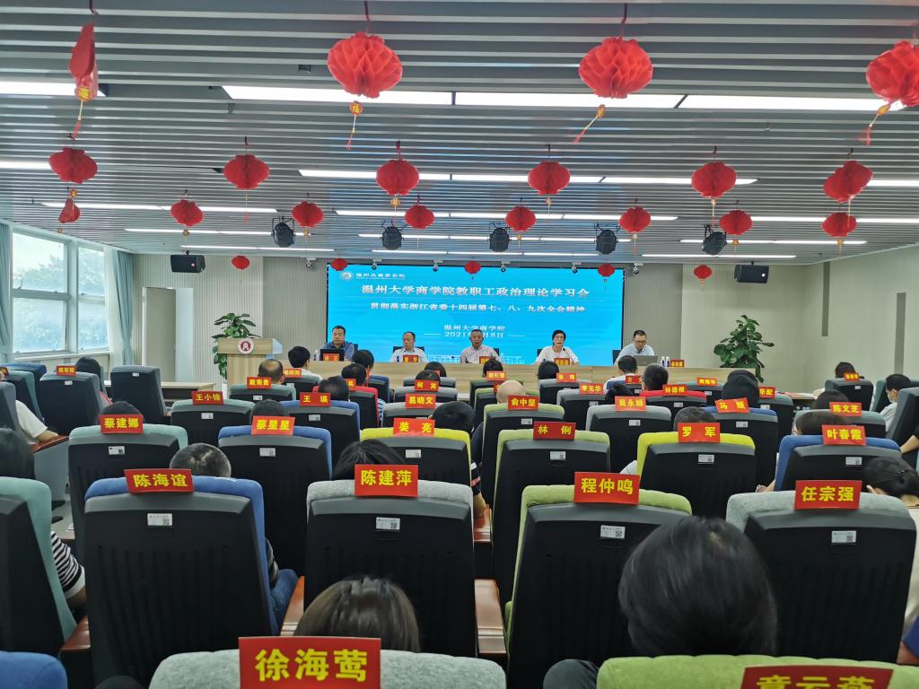 在信息楼A226仲辉商道讲堂召开教职工理论学习大会,切实提高政治站位,认真贯彻落实浙江省委十四届第七、八、九次全会精神。全体教职工参加学习会,会议由学院党委书记郑彩莲主持。