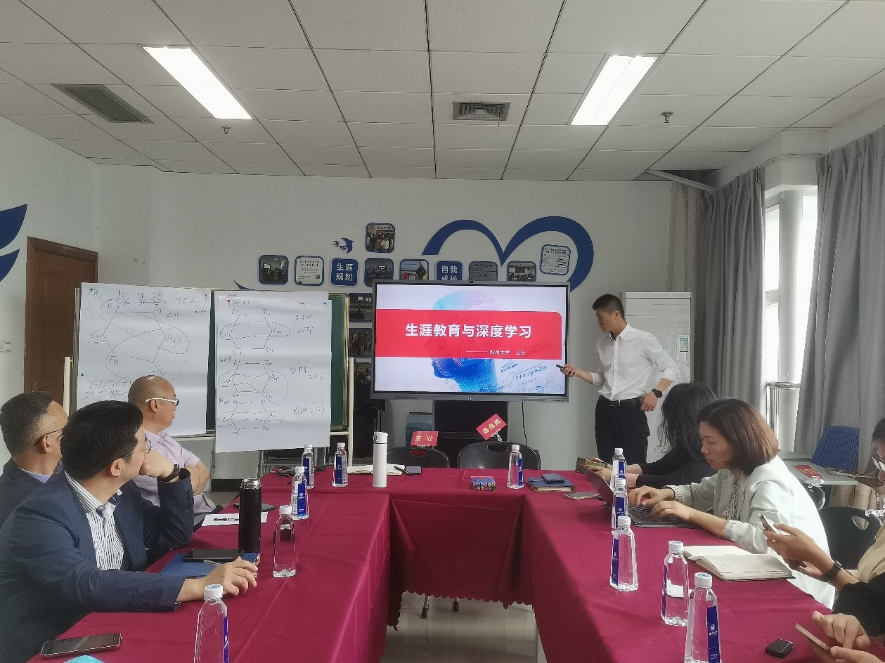 紧接着,生涯教育中心成员、温州大学学工部副部长王壮做题为《生涯教育与深度学习》的专题报告。他首先抛出三个问题:生涯教育为何?生涯教育何为?生涯教育何效?引发大家思考。随后,他围绕自身长期的课堂教学实践,结合三个案例,即MBTI小组讨论、简历三字经、以及三国人物的生涯启示,从而实现在生涯教育中引入深度学习的理念,让学习者根据自己的学习兴趣和需求,在理解的基础上主动的、批判性的学习新思想和知识,运用多样化学习策略来深度加工知识,构建个人知识体系并有效迁移。采取深度学习法在职业生涯规划咨询案例中实现融会贯通,帮助学生更加客观全面的看清过去、现在和未来,聚焦问题、发现机会、澄清路径、找到出口,在知识层面和技能层面进行深加工,形成学习共同体(创新教育者、合作学习者、高效学习者),更加有效推进生涯教育深度思考、深度学习。