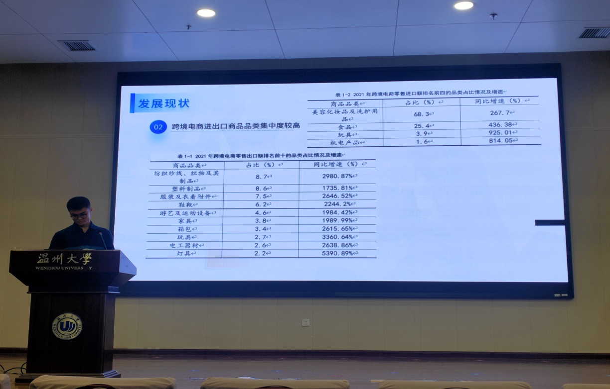 首先通过图表和数据表明跨境电商进出口规模保持高速增长的现状和热门品类,紧接着他又指出数字化转型和海外仓逐渐成为外贸企业发展的特色。尽管如此,温州的电商仍然存在主体培育不充分、支撑体系不健全等问题,需要我们不断的发展与完善。
