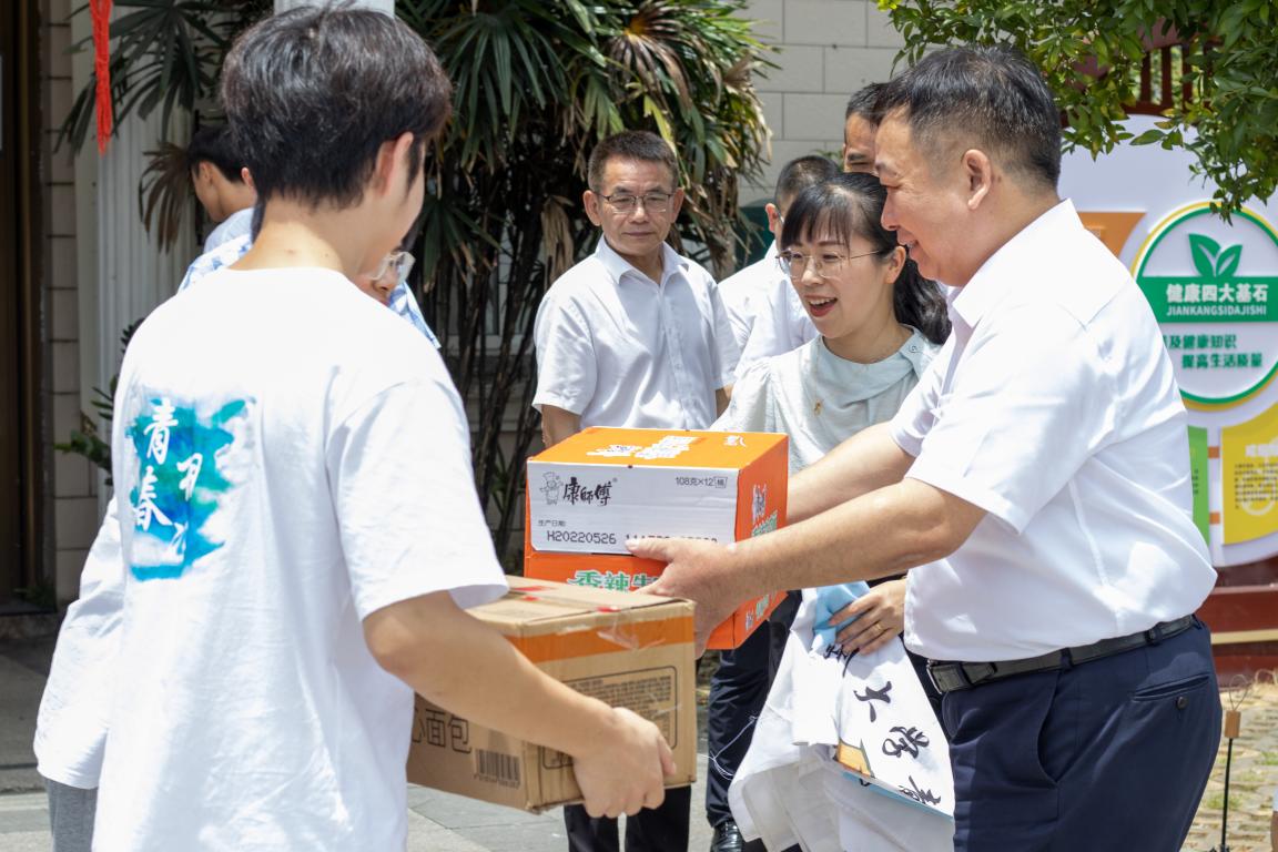最后,赵敏校长与和校团委书记易招娣一同为暑期社会实践队送上慰问品。