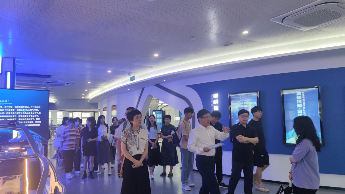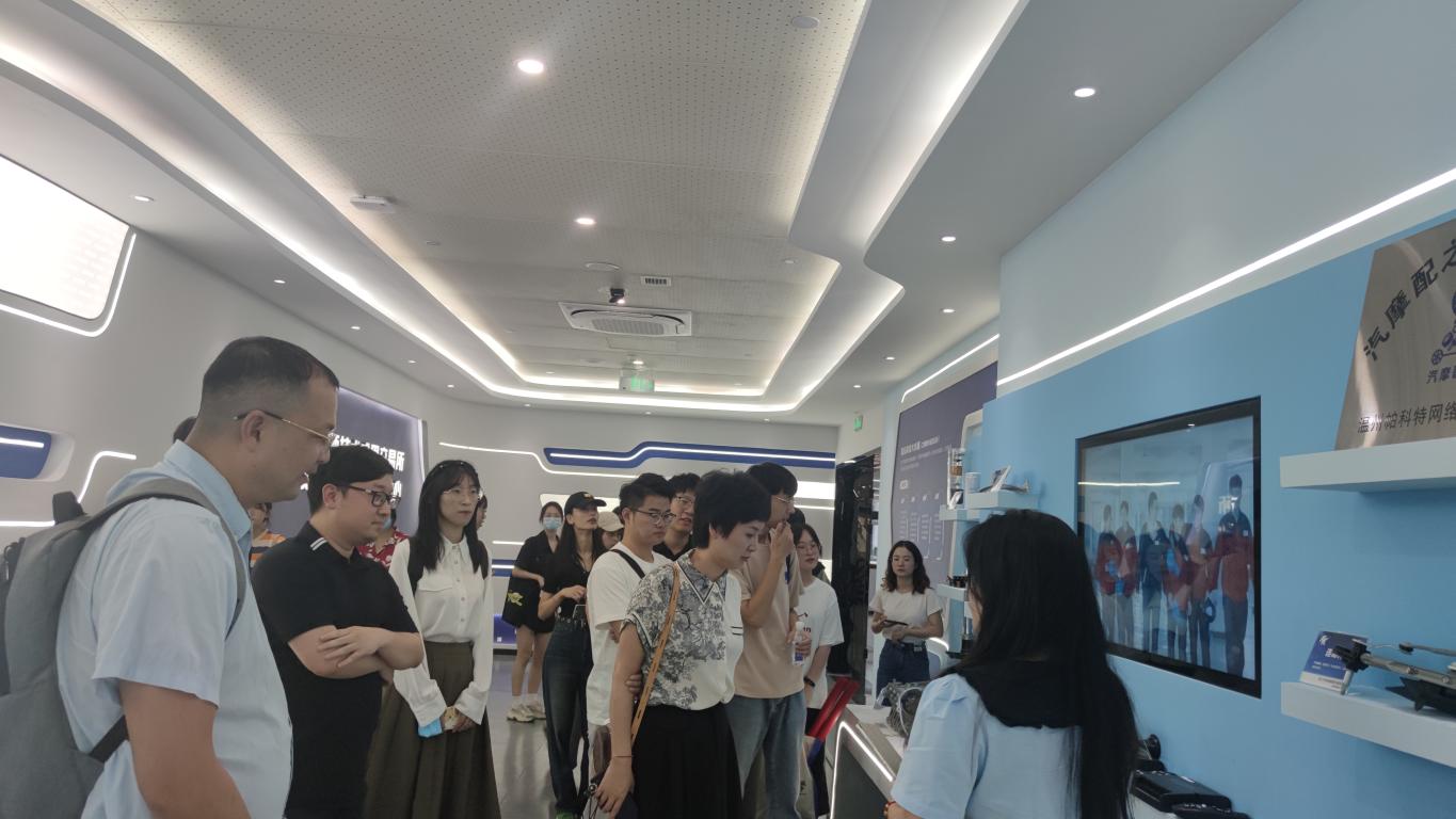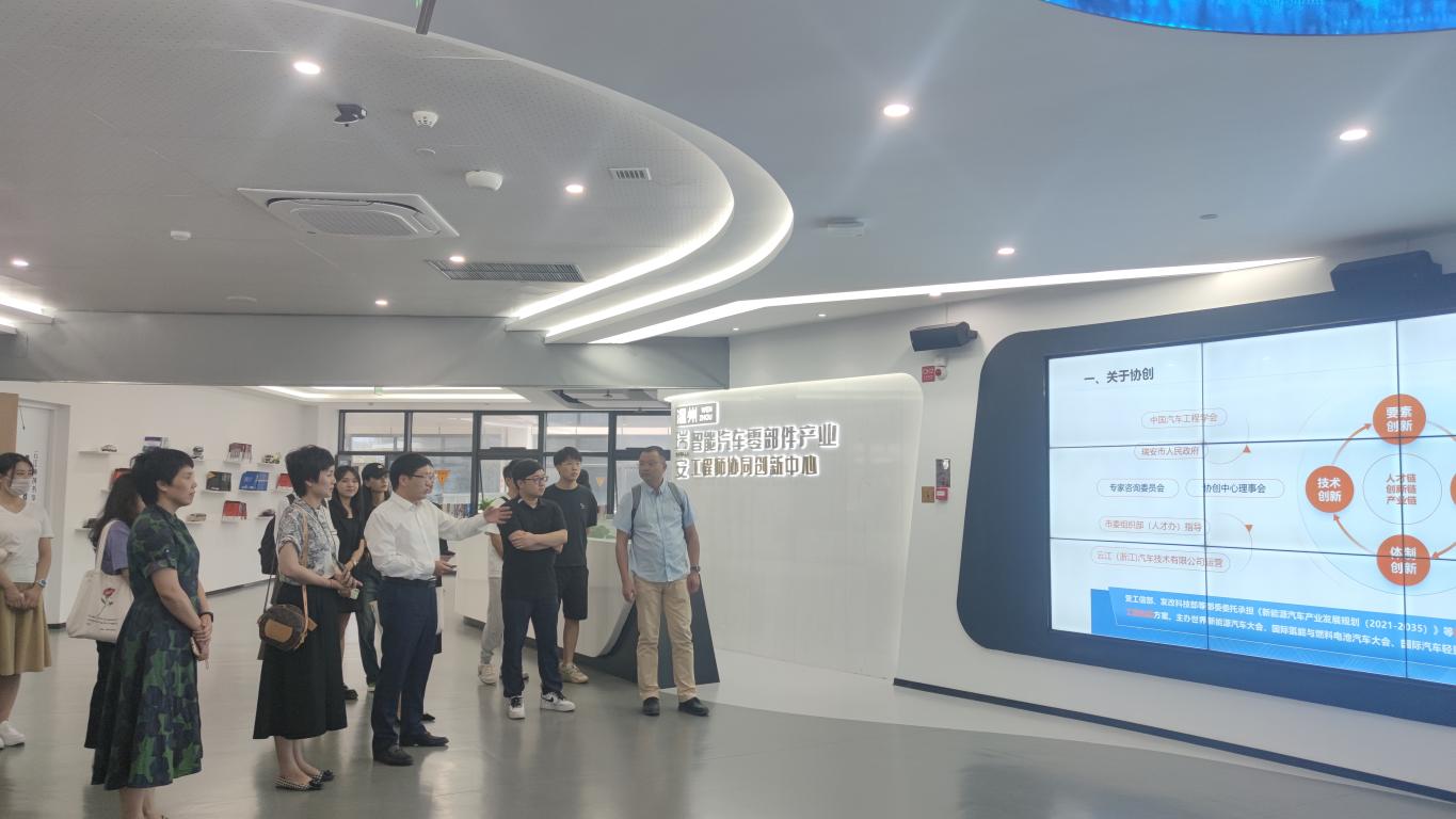 师生一行首先来到东新科创园,在温州大学瑞安研究生院党总支书记潘莉莉的带领下,参观了温州(瑞安)智能汽车零部件工程师协同创新中心、浙江省瑞安汽车关键零部件产业创新服务综合体与温州大学瑞安研究生院。温州(瑞安)智能汽车零部件工程师协同创新中心的工作人员为师生讲解了瑞安的历史底蕴、经济发展以及科创成果,介绍了瑞安的科创板图,并详细讲述了汽车等高端产业制造企业,以“一芯一轴三区“为高新技术产业发展格局,立足产业链,打造创业链。此外,协创中心主任张国祥还为同学们讲解了协创体系、专家智库、重点工作及科研成果等。