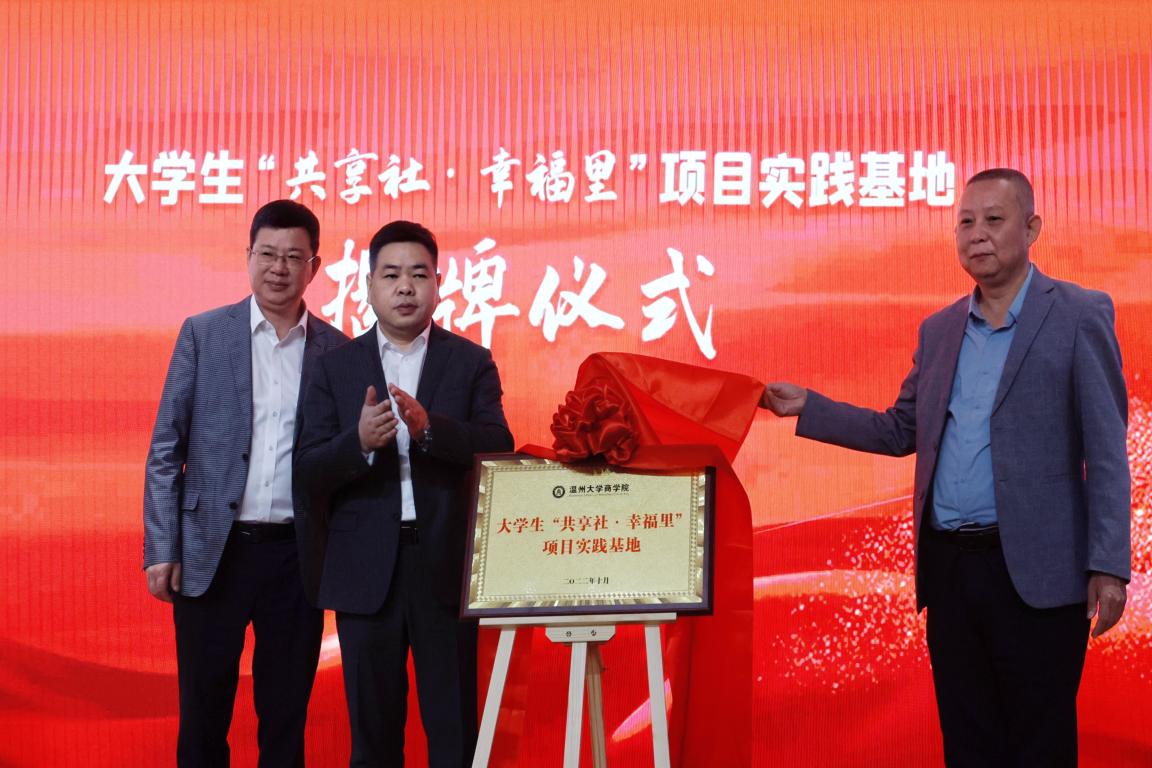 院长胡振华签订三方战略合作协议,并为大学生“共享社·幸福里”项目实践基地进行揭牌仪式。