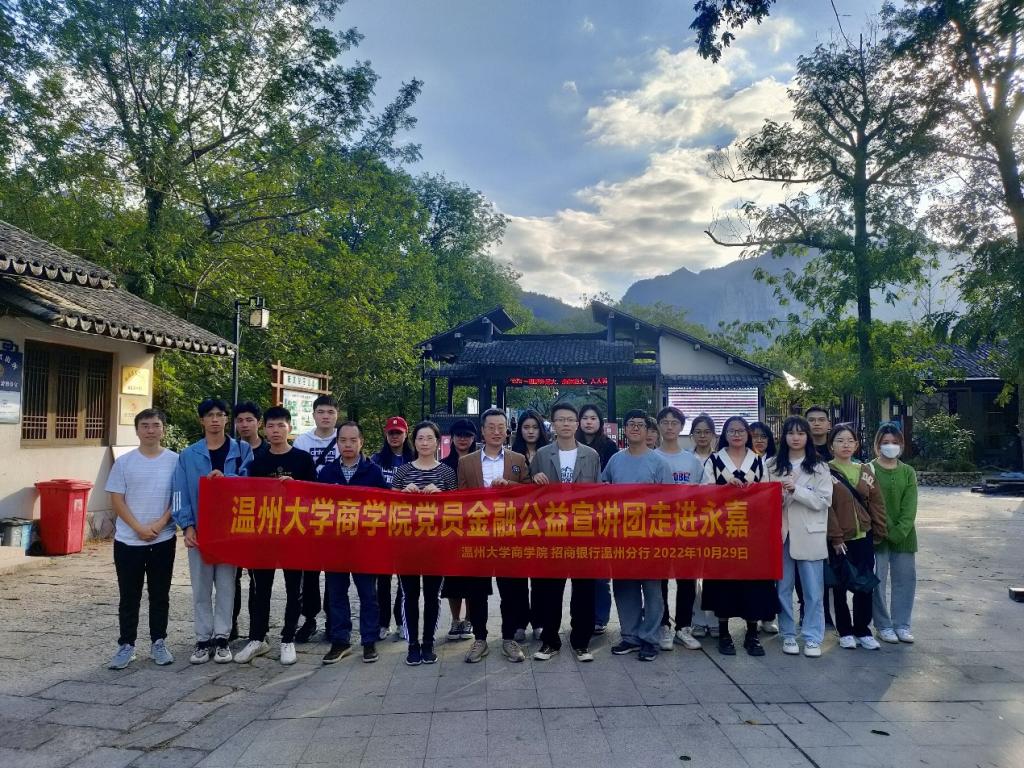 联合招商银行温州分行组织开展了“学习二十大,奋进新征程”银校党建共建主题活动。此次活动,两家单位党员代表、金融教育基地公益宣讲团成员、金融工程专业学生共120余人参与,以学定教、以教促学,走进永嘉开展研学和主题宣传,共同打造金融教育基地志愿服务品牌。