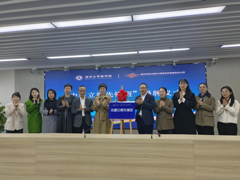 中源立德会计师事务所董事长刘旭海发表讲话。刘董事长回顾了自己在温州大学的求学生涯以及中源立德会计师事务所的发展历程。他强调,要加强学校和会计师事务所之间的联系,希望优秀学子能够充分发挥自己的能力和水平,更好地融入社会。