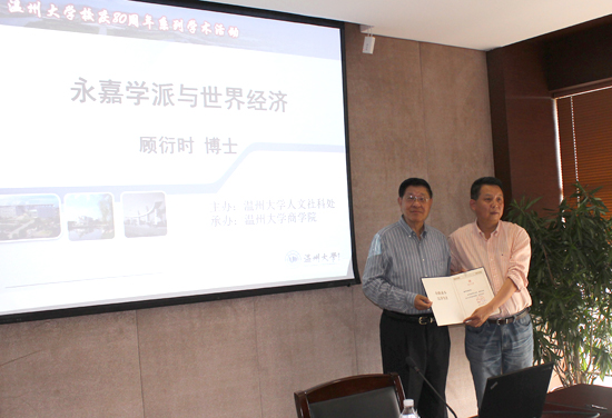 5月17日,温州大学北美校友会顾问、知名社会活动家、美籍华人顾衍时博士来校参加80周年校庆,并莅临香蕉视频 作《永嘉学派与世界经济》学术讲座。 学院党总支书记胡振华代表学校向顾博士颁发“温州大学特聘教授”证书,并介绍了学校及学院的历史变革、发展现状、特色商科等情况。顾博士结合自己在美国多年从业经验,同与会人员交流了美国财税管理的实务与制度、金融状况及财税、金融等相关法律的立法情况。 学院各系主任、相关专业老师、学生等参加了本次论坛。