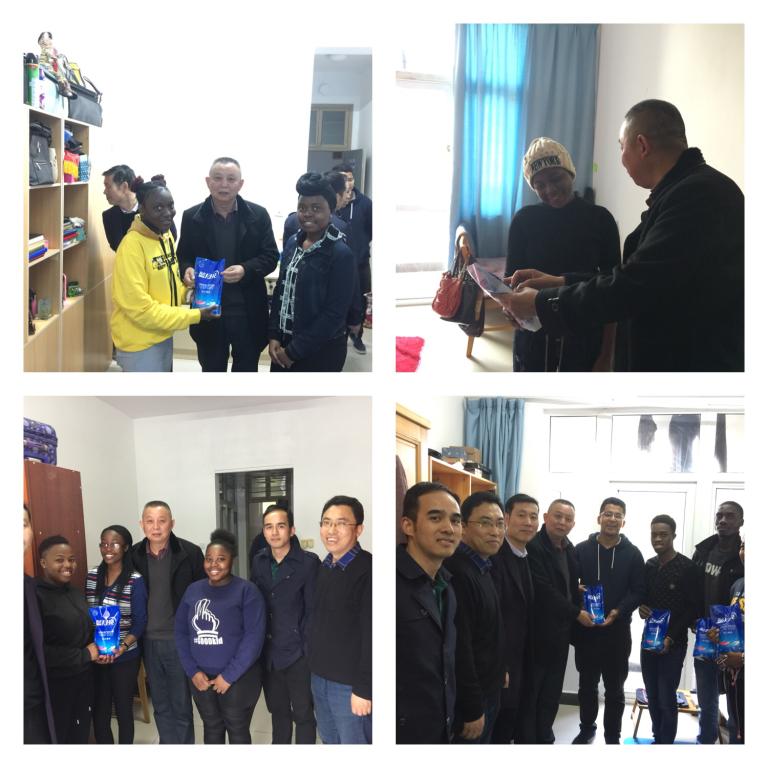 接下来胡院长一行,又相继走访了位于三楼的Ahmed Mohamed Ali,Geza Dean Tawanda等男生的寝室,位于四楼的Katiyo Linda,Mugoni Yemurai Viola,Paschal Janerose Kokutona等女生的寝室,这些寝室整体卫生状况非常好,氛围非常温馨。每到一个留学生寝室,胡振华都用英语与同学们亲切的交谈,胡院长的热情和幽默赢得了同学们的阵阵掌声和笑声。同时,每到一个寝室胡振华一行都给寝室同学送上了一份小礼物。同学们非常感谢学院领导的馈赠。