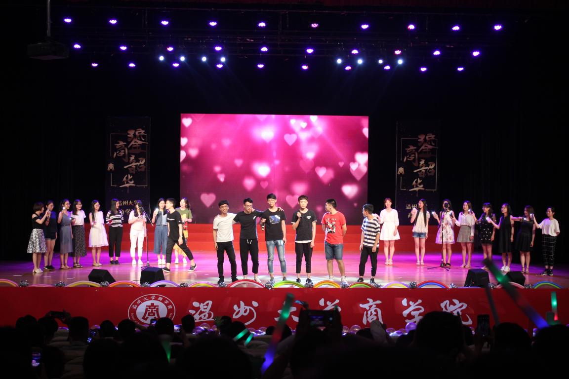 开场舞《BBoom BBoom》率先轰动全场。通过《这就是节目》、《说好不散》、《追光者》等节目,毕业生们重温了四年走过的美好点滴,背负着温暖回忆拥抱明天。沉浸于《至少还有你》和《意外》的动人歌声中,毕业生们细细回味自己内心深处的情感。毕业生沈宁怡演唱的《我怀念的》温婉柔美,毕业生陆勇演唱的《不完美小孩》深情动人,将我院学子对母校的依依不舍娓娓道来。留学生则以一首泰国歌曲深情献礼。更有小品《新倩女幽魂》、《最好的安排》使全场笑声不断,掌声和欢呼声响成一片。随后舞蹈《斗魂》及《后来的我们》将整场晚会的气氛推向高潮。