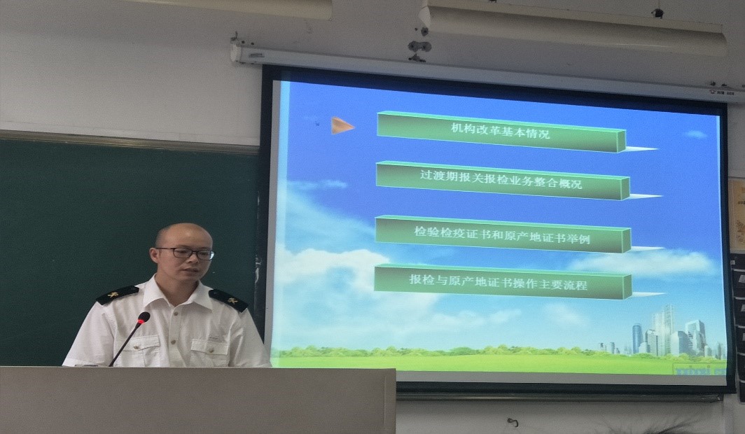 首先,国门生物安全与进出口报检负责报关报检的林志恩老师介绍了进出口检验检疫流程和出入境安全检验检疫需要注意的关键问题和实际进出口业务中遇到的问题及其注意事项。老师讲得十分细致,包括了报关报检流程的各个方面,证书的真实性,证明的填写等等,给对于初入国贸专业的我们带来了启蒙。