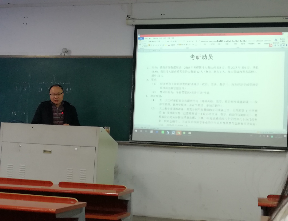 然后,周建华老师从有关考研方面着手,与同学们分享金融工程等专业考研需要准备的科目,并从自身的学习感悟和工作经历出发,向同学传授了考研方面的注意事项和备考经验,鼓励同学们激流勇进,朝着更高的学术高峰攀登。但与此同时,提醒同学们要认清事实,不能好高骛远,要选择适合自己的考研学校。分享最后对给全体同学提出宝贵建议:大一大二要夯实基础,认真做好公共课的学习;大三做好专业课的准备,在暑期做好复习准备工作并对自己进行测评,为大四第七个学期10月份填报学校提供参考。最后,以暨南大学金融学为例,招生的25个名额中保送生和推免生已经接近一半,剩余名额稀少,竞争激烈,以此温馨提醒同学们报考学校不可盲目,需量力而行。