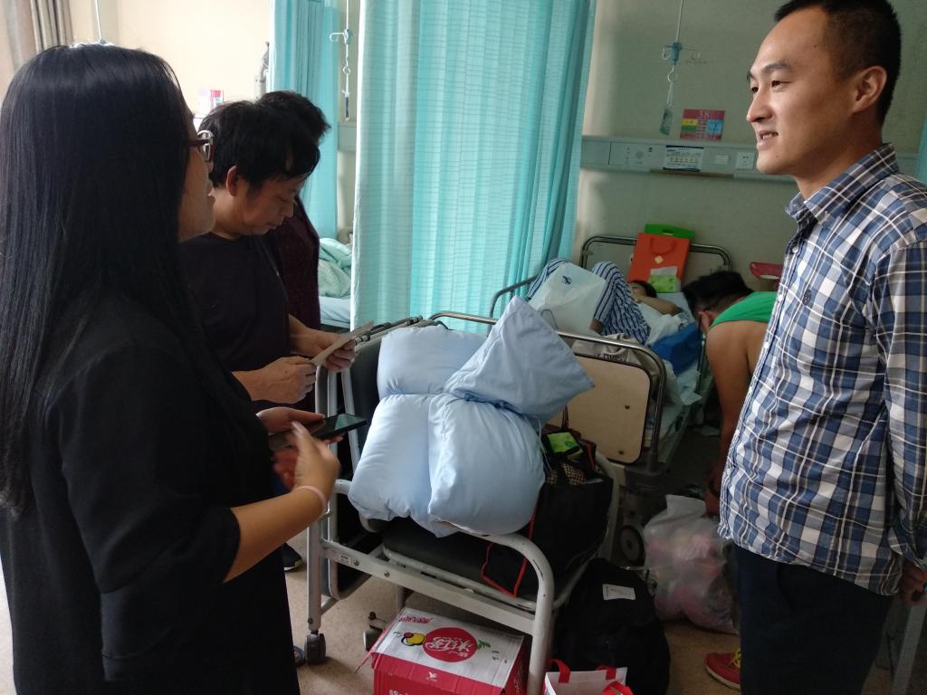 教工第五支部在支部书记黄兴利的带领下,委派周飞、黄汉两位同志代表一同来到附一医,详细了解学生的治疗情况以及恢复情况,并嘱咐学生安心养伤,积极配合治疗。当学生家长接到老师们的爱心款,由衷的向支部表达感谢,同时感谢学院领导在入院治疗期间多次看望学生并安排人员值班陪护,体现了温州大学的大爱和温暖。