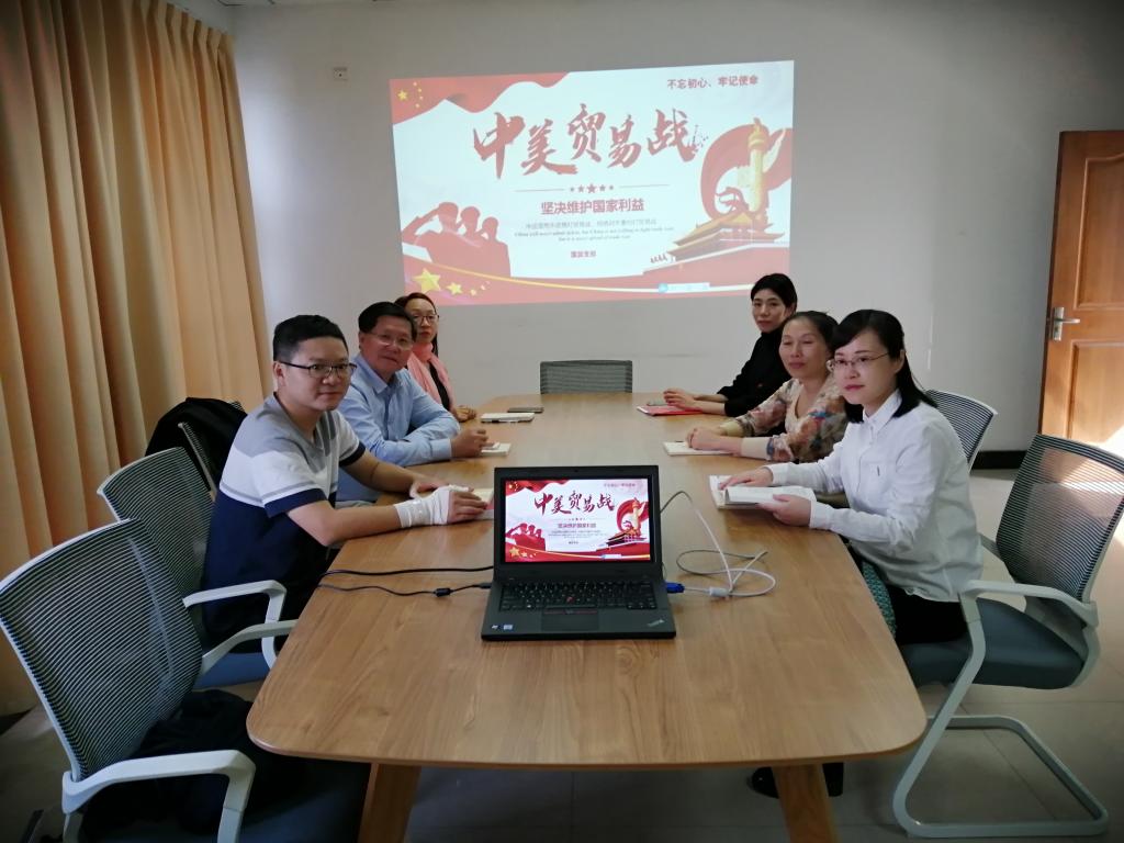教工第二支部(国贸系)在A308会议室开展“中美贸易战—坚决维护国家利益”的主题教育活动。