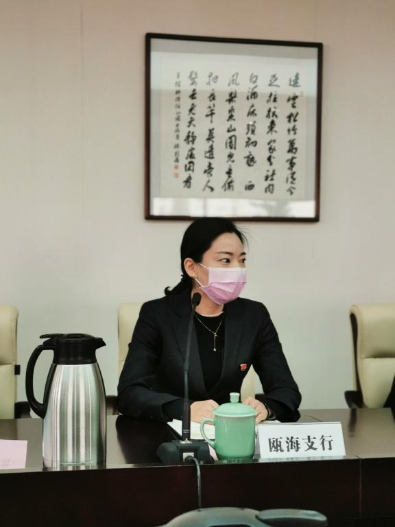 党委书记郑彩莲,副院长罗建利,党委委员、金融工程系支部书记周建华,财务会计系主任张烨,办公室主任张素琴,辅导员黄汉一行人赴“银校共建”单位--中国建设银行温州分行走访调研,共商瞄准“重要窗口”新定位,推动银校共建向纵深发展的新举措。中国建设银行温州分行行长徐刚、副行长夏诒恒、瓯海支行行长叶慧、办公室总经理潘海章、人力资源部总经理钱克标、公司业务部总经理吴招程、金融科技经营中心主任潘建聪、个人金融部副经理刘笑笑、机构业务部周洪峰热情接待。