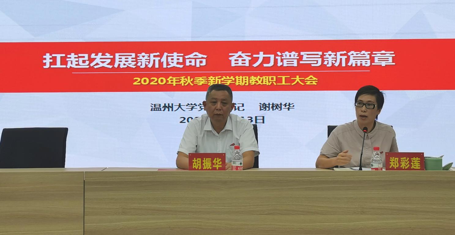 举行2020年新学期教职工理论学习大会,认真学习贯彻落实温州大学秋季开学大会上谢树华书记的重要讲话与赵敏校长的专题报告精神。全体教职工参加学习会,会议由学院党委书记郑彩莲主持。