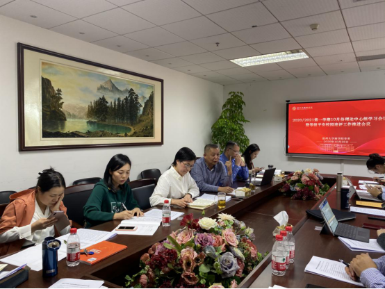 党委在A222室召开本学期10月份理论中心组学习会并安排部署下阶段各项工作。本次会议由党委书记郑彩莲主持,学院班子成员、纪委委员、支部书记及全体辅导员参会。